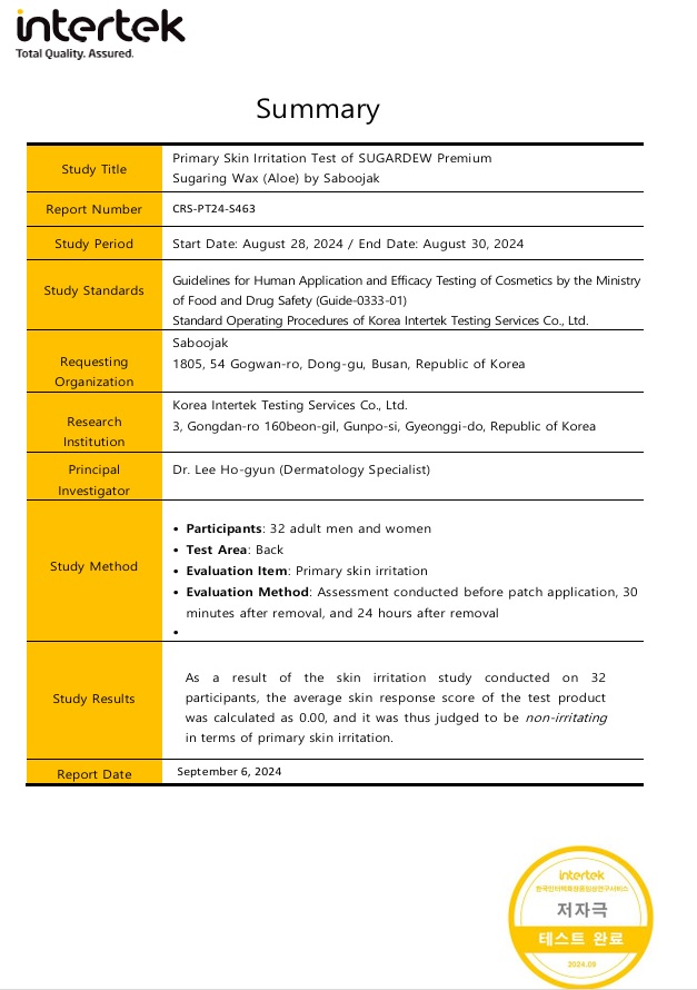 About Us Our promises EWG Green ingredients 100% HACCP certified facility 100% Made in Korea 100% Strict manufacturing process 100% Effort to reduce Skin irritation SugarDew contains best ingredients for skin irritation Centella Aloe Eucalyptus Green tea Certifications & Registraions SugarDew is registered by Australian department of Health and Aged care Irritation on skin Test Sugardew has undergone a skin irritation test and was found to cause minimal irritation